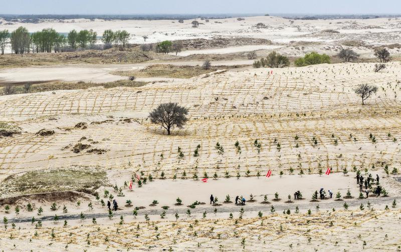 4月19日,在内蒙古通辽市科尔沁左翼后旗束力古台防沙治沙项目区,治沙工人们铺设草方格、栽种樟子松,为黄沙披上“绿装”。