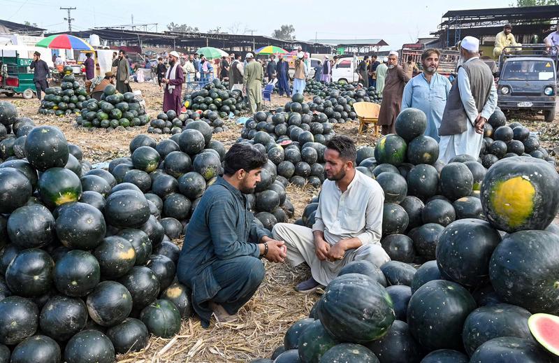 4月20日,在巴基斯坦白沙瓦,人们在水果市场交易新鲜西瓜。