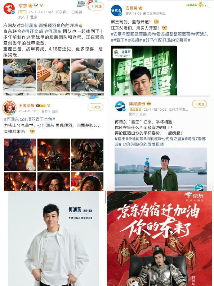 记者梳理发现,近期何润东已接到了多个品牌的商务合作,如支付宝,王者荣耀,安慕希,苏超等。