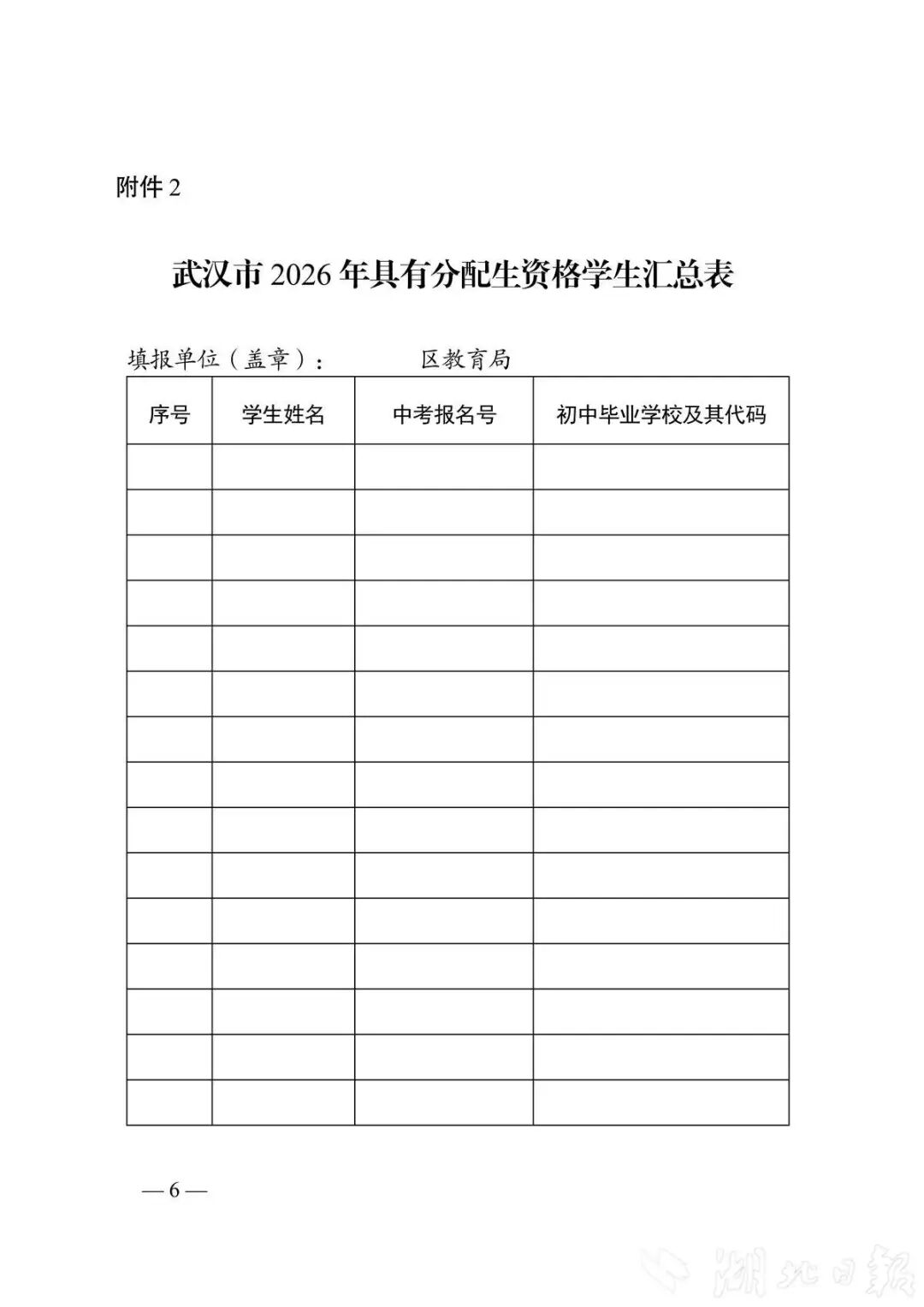 2.各区审定、上传。4月24日前,各初中学校将公示无异议的具有分配生资格学生名单报区教育局。区教育局审定后,汇总名单于4月25日前上传武汉市中招综合管理平台(网址:zkzz.whzkb.cn),同时将《武汉市2026年具有分配生资格学生汇总表》(纸质盖章版和Excel格式电子稿)报市教育局基础教育处。