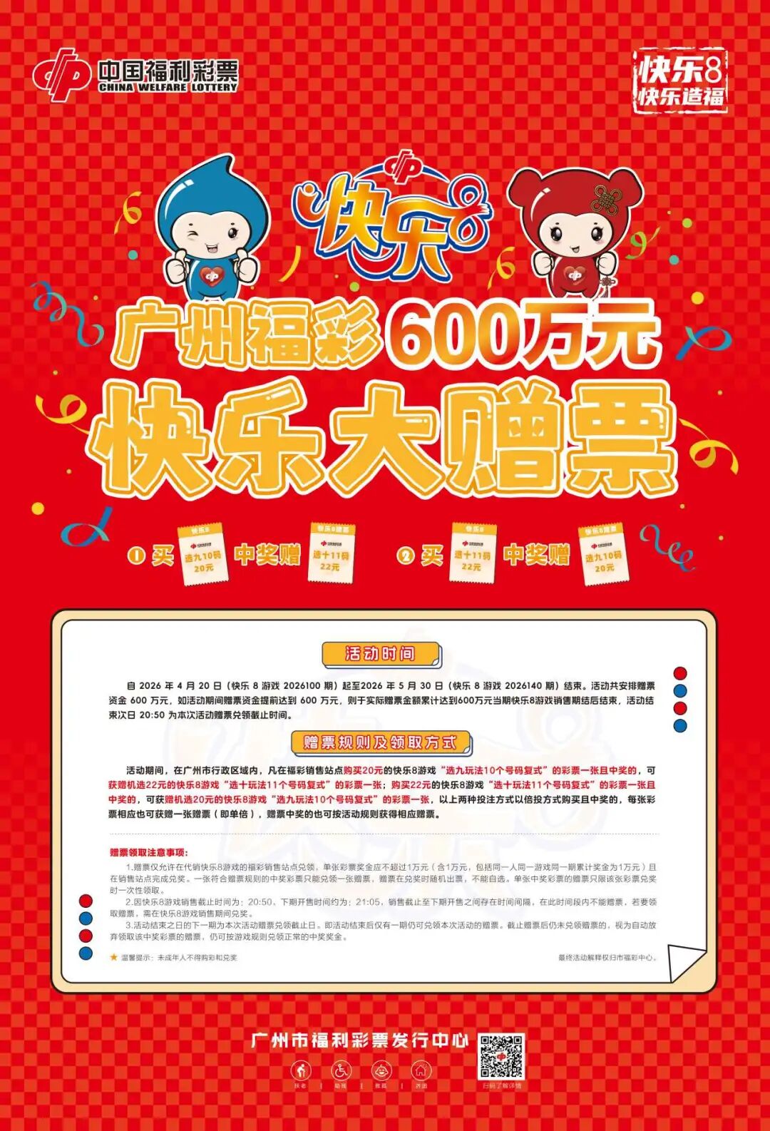 本次活动共安排赠票资金600万元,计划至2026年5月30 日(快乐8游戏2026140期)结束,如活动赠票金额累计达到600万元,则在赠票金额用完的当期快乐8游戏期结后结束,活动结束次日20:50为本次活动赠票兑领截止时间。即活动结束后仅有一期仍可兑领本次活动的赠票,截止赠票后仍未兑领赠票的,视为自动放弃领取该中奖彩票的赠票,仍可按游戏规则兑领正常的中奖奖金。