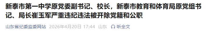 据泰安市纪委监委消息:日前,经泰安市委批准,泰安市纪委监委对新泰市第一中学原党委副书记、校长,新泰市教育和体育局原党组书记、局长崔玉军严重违纪违法问题进行了立案审查调查。