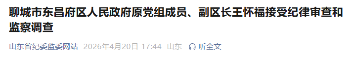 据聊城市纪委监委消息:聊城市东昌府区人民政府原党组成员、副区长王怀福涉嫌严重违纪违法,目前正接受聊城市纪委监委纪律审查和监察调查。