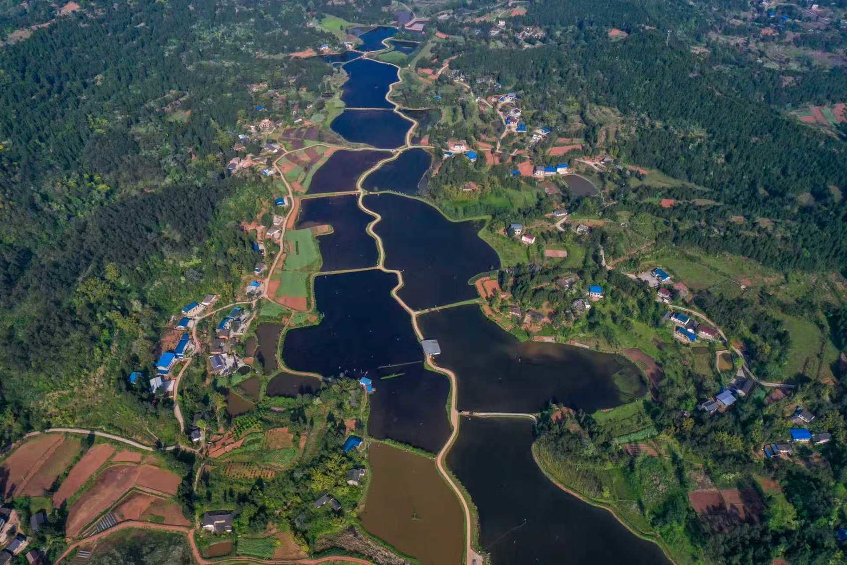 从空中俯瞰营山县稻渔现代农业园区,大大小小的鱼塘连成一片。