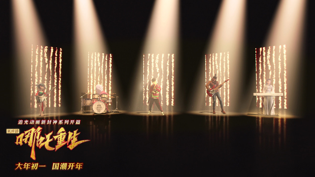 本支MV作为春节限定乐队的首次亮相,“神仙阵容”迅速俘获网友们的眼球。《新神榜:哪吒重生》“新哪吒”李云祥、面具人,《白蛇:缘起》小白、宝青坊主再次实现追光厂牌联动,更与大张伟跨次元集结,施展十八般才艺,玩转吉他贝斯键盘架子鼓,满满国潮范。而超洗脑的旋律下,机车酷盖李云祥舞姿魔性、面具人的萌物小猴子花式抢镜、小白与宝青坊主各具风情,热闹年味扑面而来,令人期待大年初一与新哪吒红红火火迎牛年。