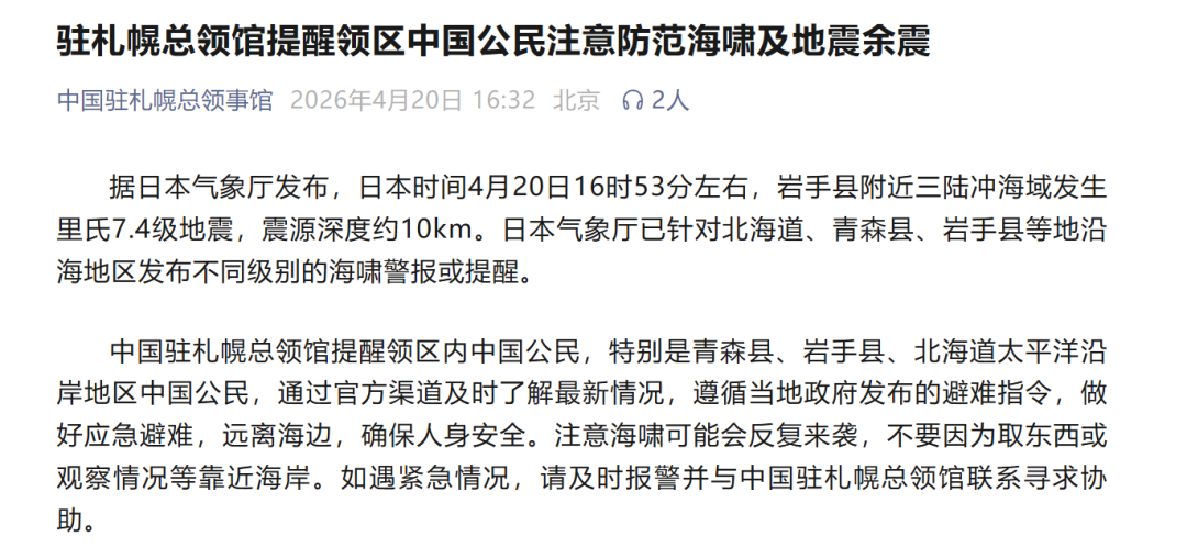驻札幌总领馆提醒领区中国公民注意防范海啸及地震余震 据日本气象厅发布,日本时间4月20日16时53分左右,岩手县附近三陆冲海域发生里氏7.4级地震,震源深度约10km。中国驻札幌总领馆提醒领区内中国公民,通过官方渠道及时了解最新情况,遵循当地政府发布的避难指令,做好应急避难,远离海边,确保人身安全。如遇紧急情况,请及时报警并与中国驻札幌总领馆联系寻求协助。(详情请戳↓↓↓)