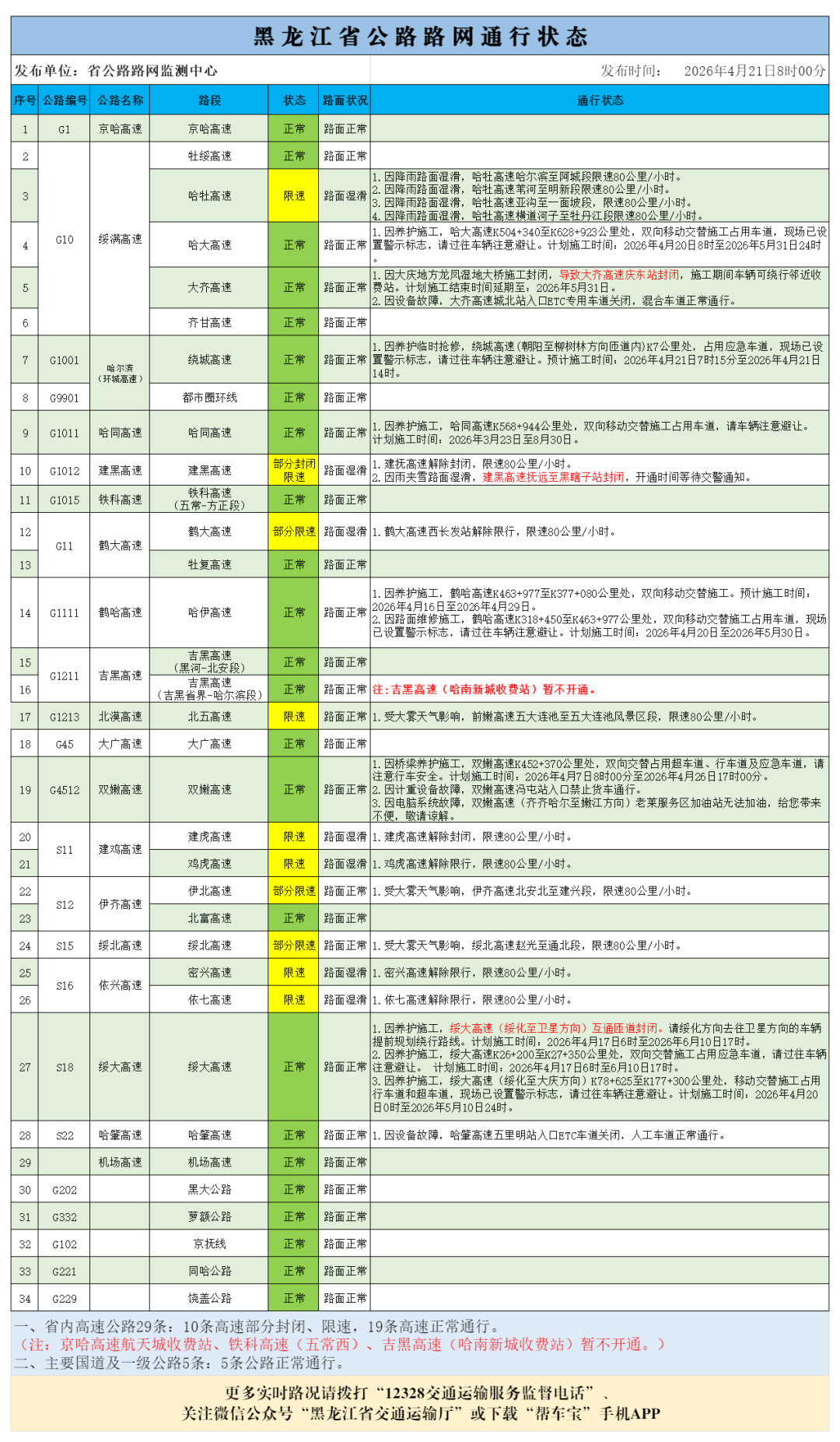 4月21日8时汇总路况信息:部分封闭限速的高速有(10条高速):1.鹤大高速(西长发站)、绥北高速(赵光至通北站)、伊北高速(北安北至建兴站)、北漠高速、鸡虎高速、密兴高速、依七高速、哈牡高速、建虎高速、建黑高速(米都机场至前哨站),限速80公里/小时。2.建黑高速(抚远至黑瞎子站),封闭。省内其它高速路况正常。