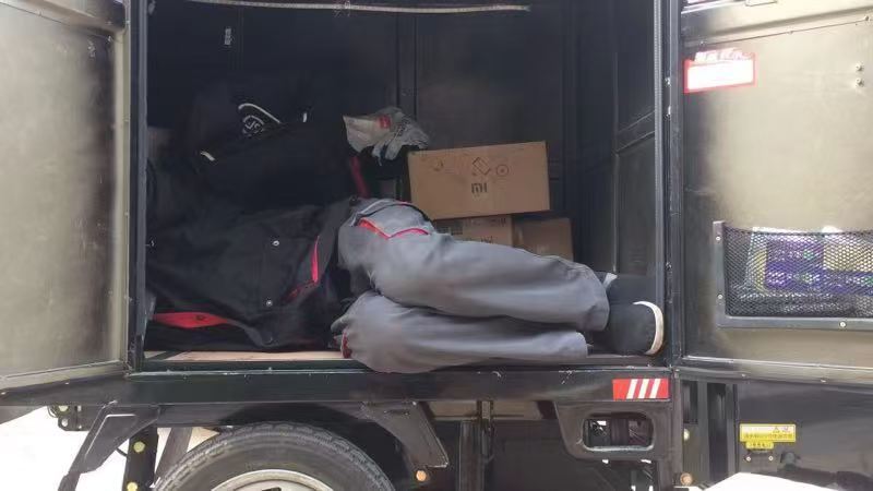 因疲惫,只能蜷缩在快递车中休息(本人提供)