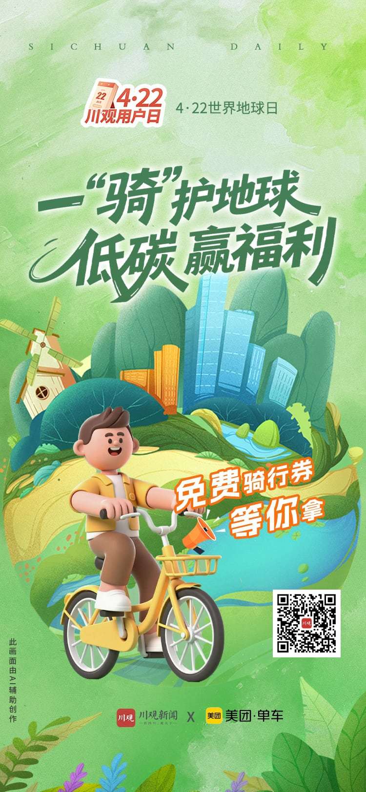 近年来,川观新闻积极践行主流媒体绿色传播使命,助力低碳生活走进千家万户。在这个专属地球的日子里,川观新闻联合美团单车发起“一‘骑’护地球,低碳赢福利”主题活动,诚邀市民群众用骑行赴约,用行动为地球“减负”,更准备了专属福利等你来拿!