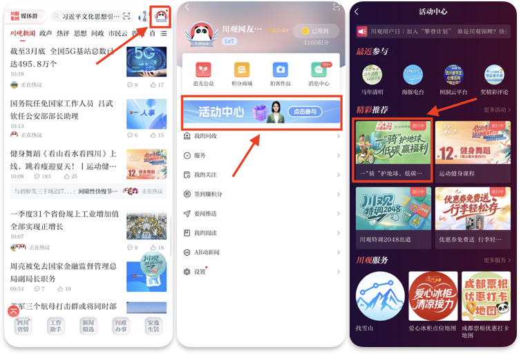 方式二:在川观新闻首页,点击右上角“我的”图标,再点击“活动中心”,找到“一‘骑’护地球,低碳赢福利”活动图片,进入参与。