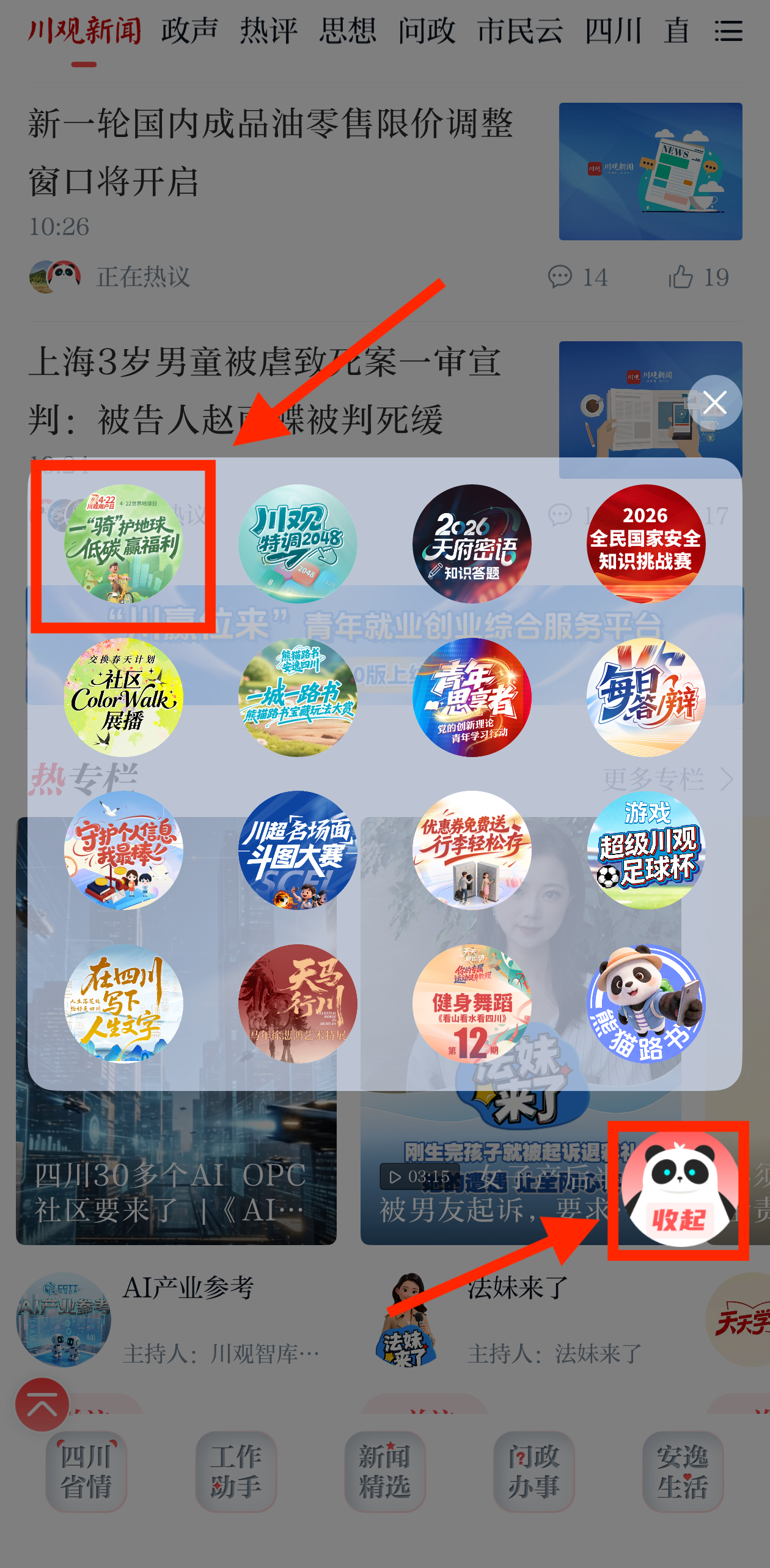 方式一:在川观新闻首页,点击右下方悬浮球,找到“一‘骑’护地球,低碳赢福利”活动图片,进入参与;