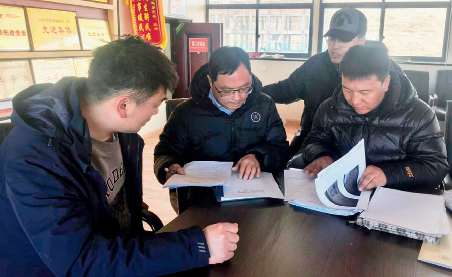 汪本阳(左二)和上一任驻村干部交接工作。图/雅妹