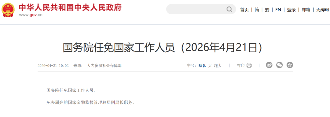 免去周亮的国家金融监督管理总局副局长职务。