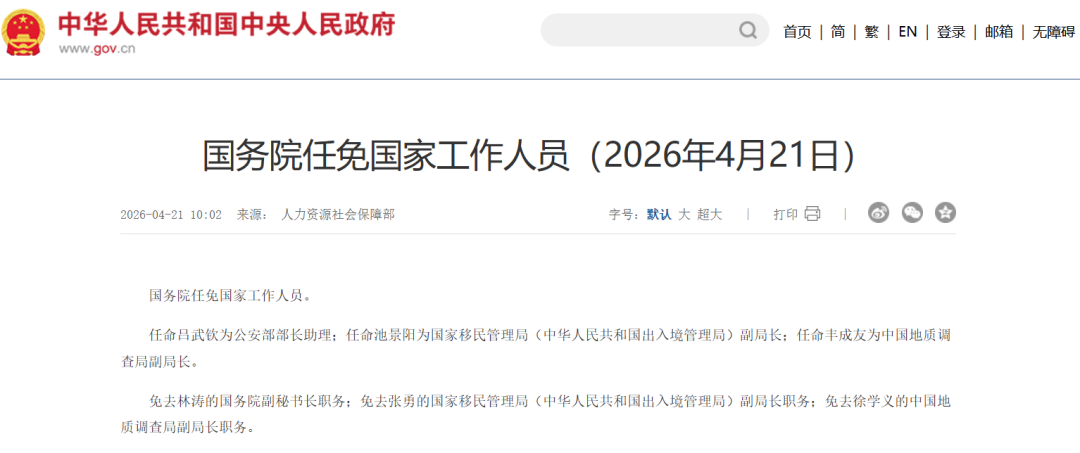 任命吕武钦为公安部部长助理;任命池景阳为国家移民管理局(中华人民共和国出入境管理局)副局长;任命丰成友为中国地质调查局副局长。