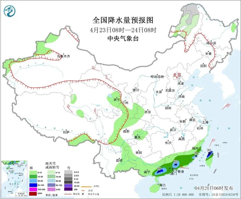 后天,内蒙古东北部、黑龙江西北部等地部分地区有小雪或雨夹雪。广西东南部、广东中南部、福建东南部、台湾岛等地部分地区有中到大雨,局地有暴雨(50~90毫米)。内蒙古西北部、青海南部和西部、甘肃河西等地部分地区有4~6级风,东海北部有6~7级风、阵风8级。