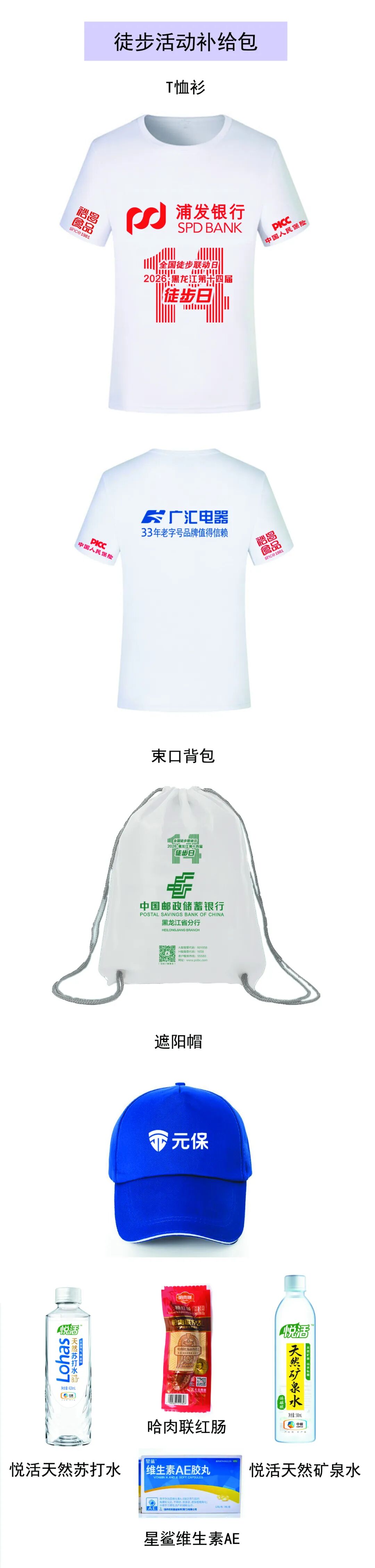 3、活动补给包:活动为每位参加人员免费提供补给包,包括:T恤衫、遮阳帽、束口背包、哈肉联红肠、星鲨维生素AE等。活动当日:穿着活动定制T恤,按时抵达音乐公园广场,简短的仪式后集体出发。(提前出发将无法领取补给水哦!)