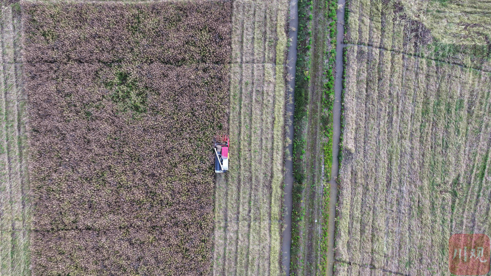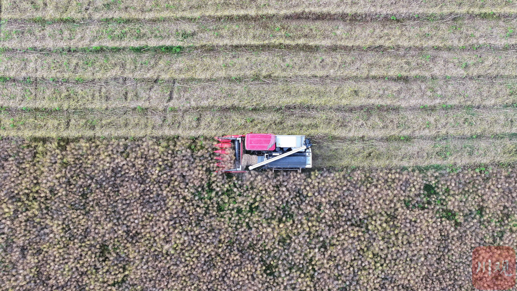 放眼望去,广阔的田野间,昔日吸引八方游客打卡的油菜花海已蜕变为连片成熟的油菜籽。伴随着收割机的轰鸣声,一排排油菜应声卷入机器内,经脱粒、清杂,饱满圆润的菜籽源源不断地输送至机身储粮仓,秸秆则被均匀粉碎抛撒还田,全程一气呵成。
