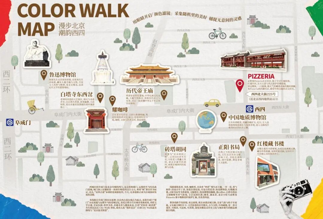 Colorwalk微旅行线路全程1.7公里,位于被老舍先生称为“北京最美大街”的阜朝大街西段。自阜成门到西四,沿途包含八大核心地标及多个精品美食打卡点,既承载着阜成门“煤门”的历史底蕴与运煤车马的老城记忆,又展现出白塔寺片区城市更新的成果,串联起古都风貌与现代活力。