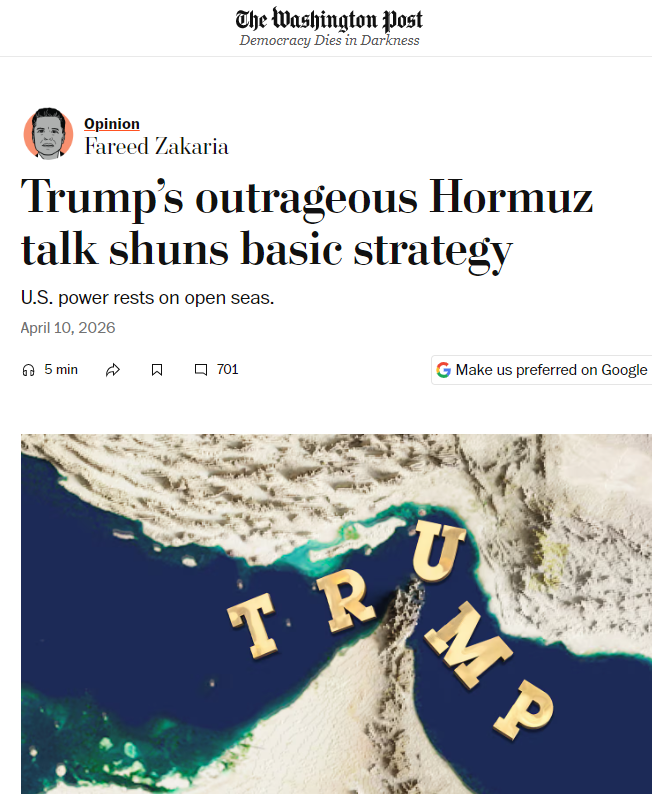 4月10日,扎卡里亚在其发表在《华盛顿邮报》上的署名文章中进一步剖析了美国领导人的“交易本质”,揭示了美国对权力的病态理解。