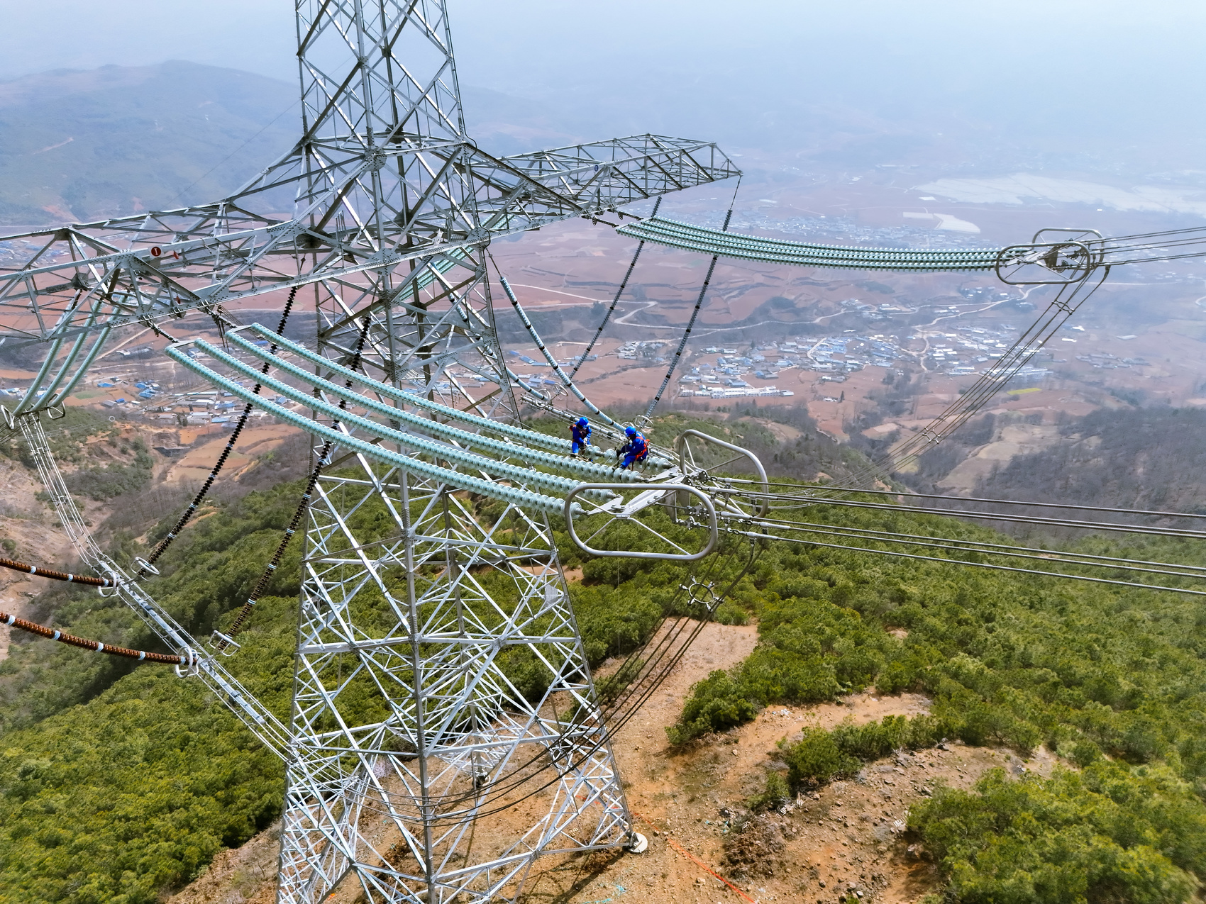 国网四川超高压公司检修人员为白鹤滩—浙江±800千伏特高压直流工程输电线路更换绝缘子。罗伍达 摄