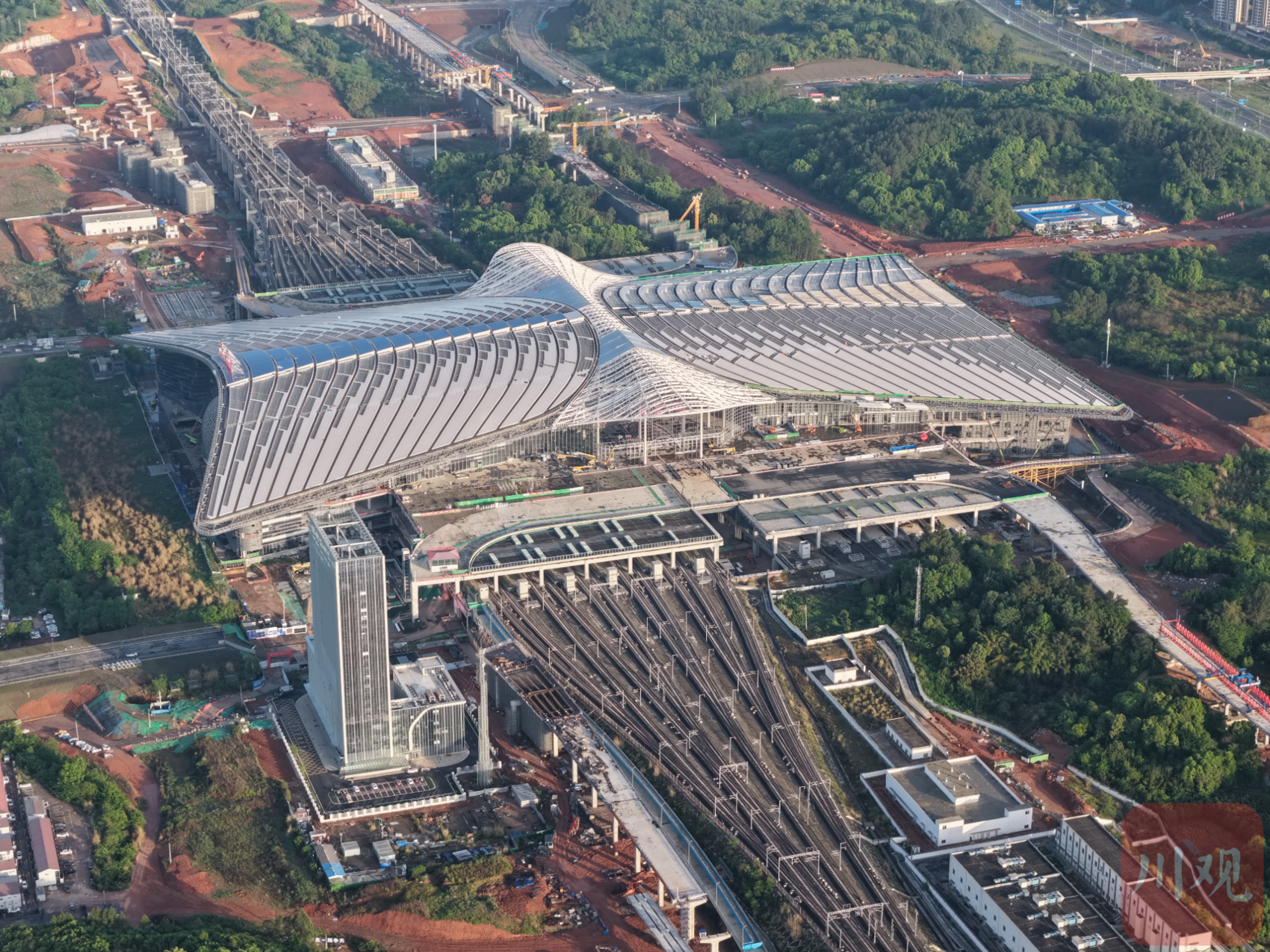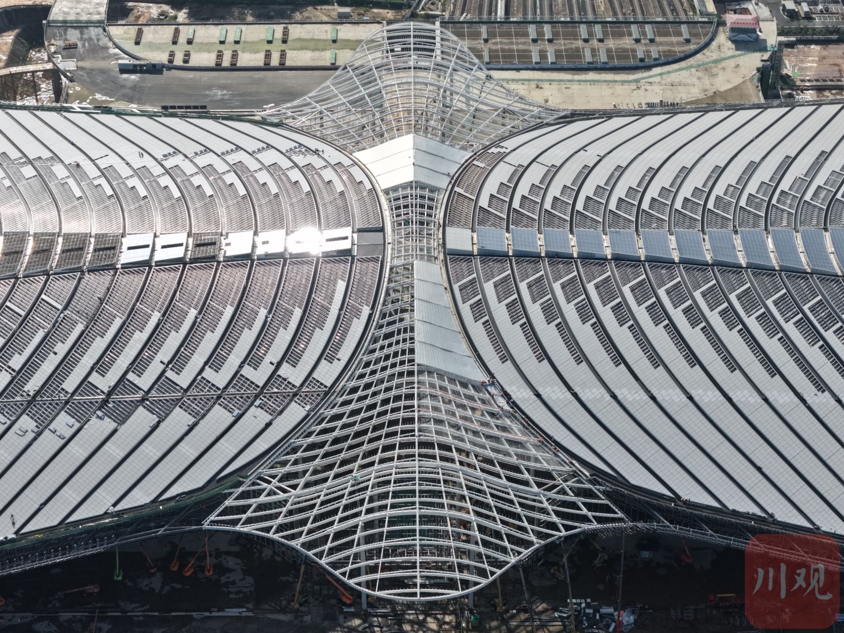 据了解,站房外立面玻璃幕墙安装在4月里已完成70%,标志性的“凤凰眼”结构正精细安装,整体工程稳步推进。