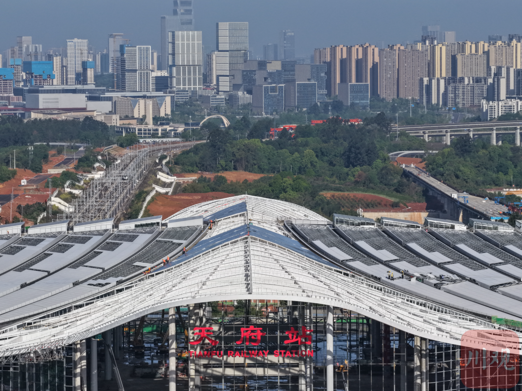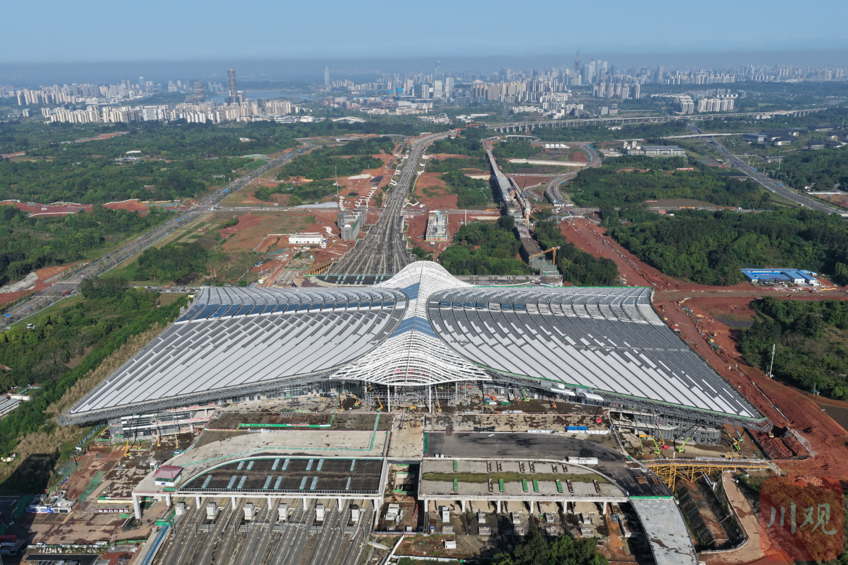 建设中的天府站,建筑造型宛如展翅的凤凰。
