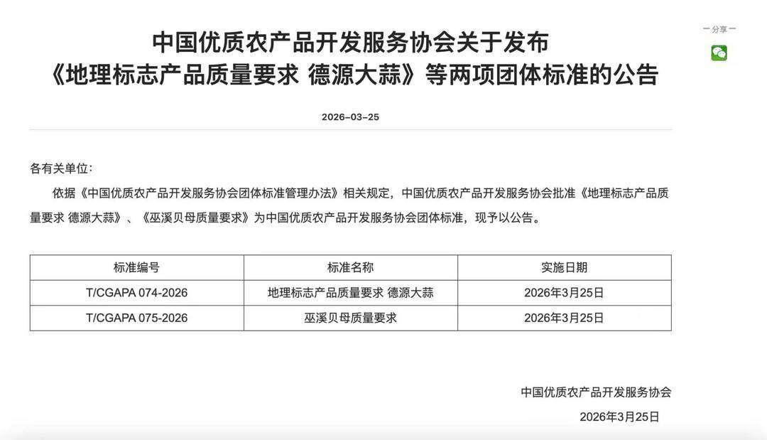 近日,由中国优质农产品开发服务协会批准的团体标准《地理标志产品质量要求 德源大蒜》正式发布。该标准为国家地理标志保护产品——德源大蒜构建起全链条质量管控体系,从产地环境到最终产品提出了系统化质量要求,使德源大蒜的品质管控有据可循。