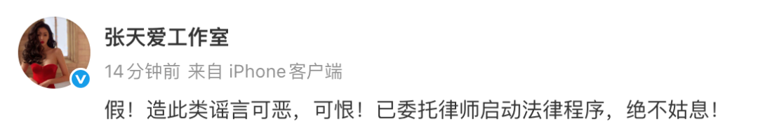4月21日,张天爱工作室发文辟谣:“假!造此类谣言可恶,可恨!已委托律师启动法律程序,绝不姑息! ”