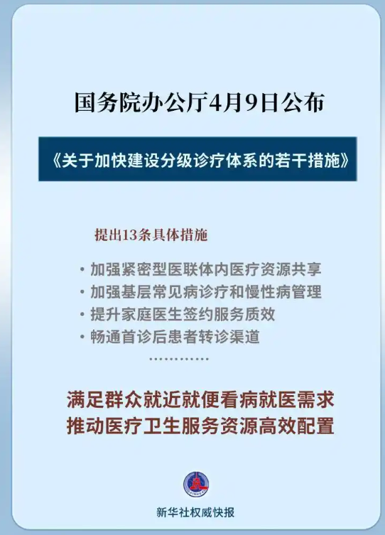 为进一步推动医疗卫生服务资源高效配置,满足群众就近就便看病就医需求,国务院办公厅近日印发《关于加快建设分级诊疗体系的若干措施》(以下简称《若干措施》),提出4个方面13项针对性举措。(4月10日《人民日报》)
