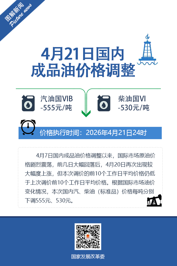 国家发展改革委发布消息,4月7日国内成品油价格调整以来,国际市场原油价格剧烈震荡,前几日大幅回落后,4月20日再次出现较大幅度上涨,但本次调价的前10个工作日平均价格仍低于上次调价前10个工作日平均价格。根据国际市场油价变化情况,自4月21日24时起,国内汽、柴油(标准品)价格每吨分别下调555元、530元。
