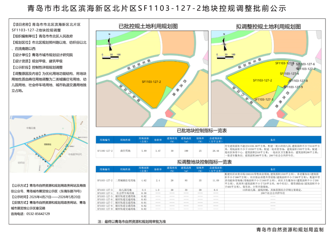 4月21日,青岛市自然资源和规划局发布了青岛市市北区滨海新区北片区SF1103-127-2地块控规调整。