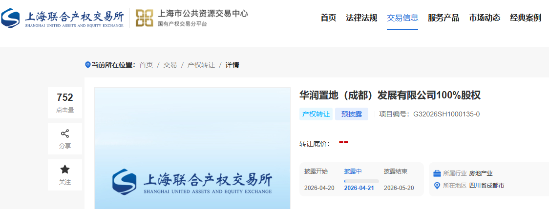 截至目前,本次华润置地成都公司股权正式挂牌价格、意向受让方、后续运营管理权限等核心信息尚未公布,后续进展有待产权交易平台正式披露。