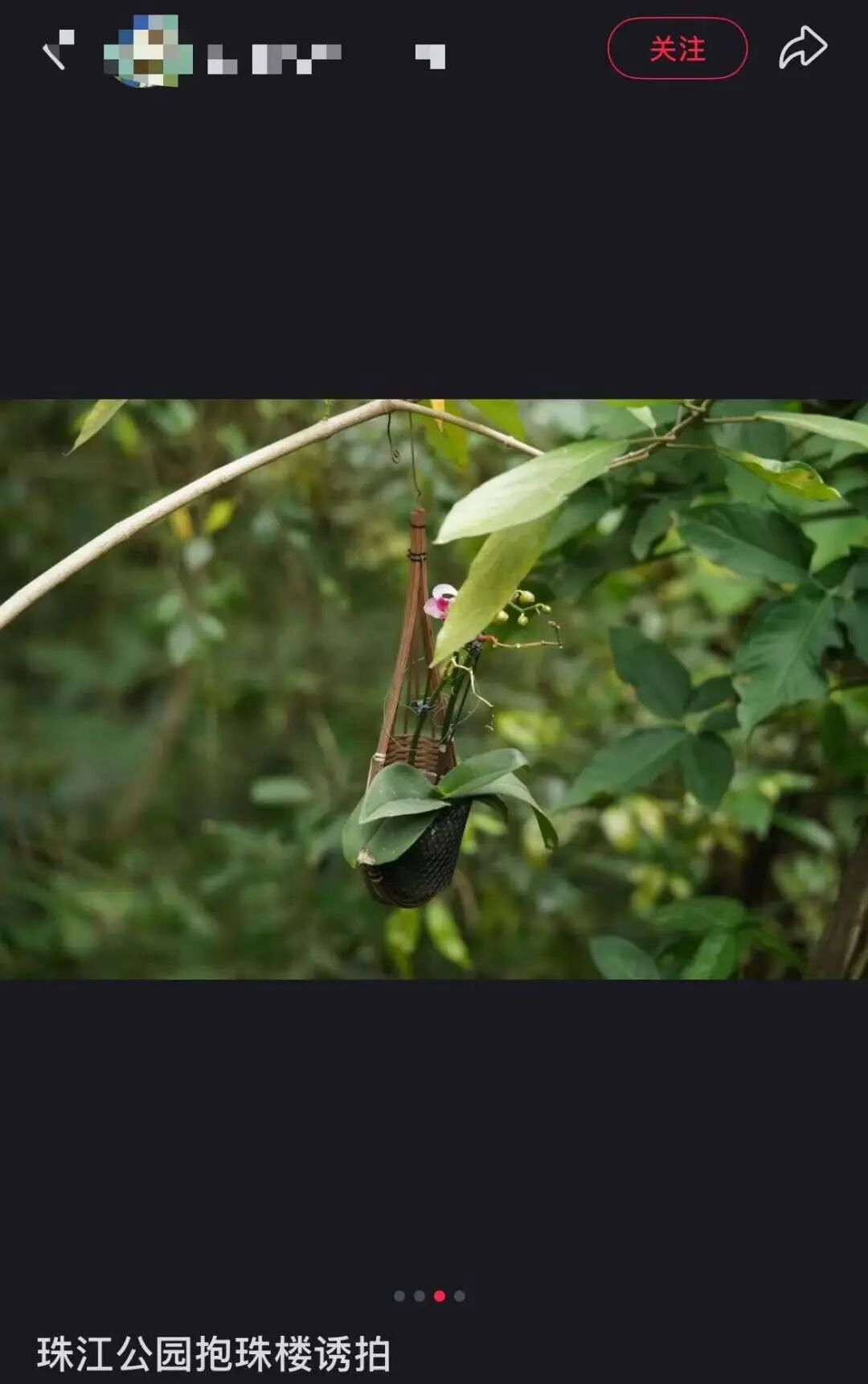 同样的诱拍手段,并不局限于华南农业大学这只黑冠鳽。记者根据网友线索,走访流花湖、珠江公园、浔峰岗公园,发现了各种诱拍装置:铁丝串面包虫绑在树枝上,甚至有人用蓝牙音箱循环播放鸟鸣。