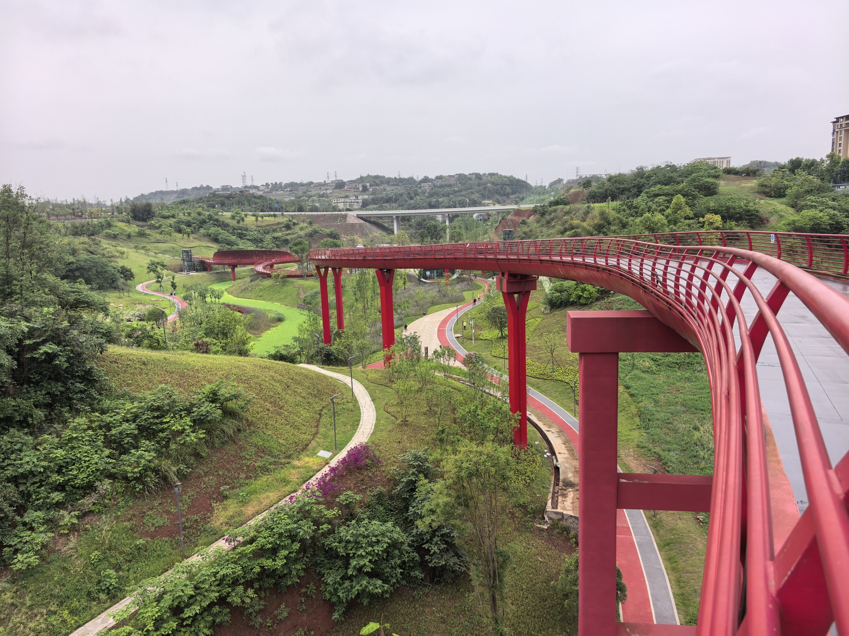 全长800米的“S”形红色景观桥,如一条“混天绫”横跨云峰路,是柏木溪生态公园最引人注目的景观。4月21日,桥上的工人们正在进行沥青铺装及附属工程施工;桥下,海绵展厅室内装饰与绿化维护同步推进。