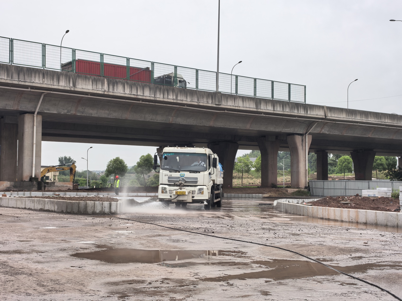 4月21日,在纳溪区倒流河北侧40米道路工程现场,高压清洗车正对路面进行清洁作业。