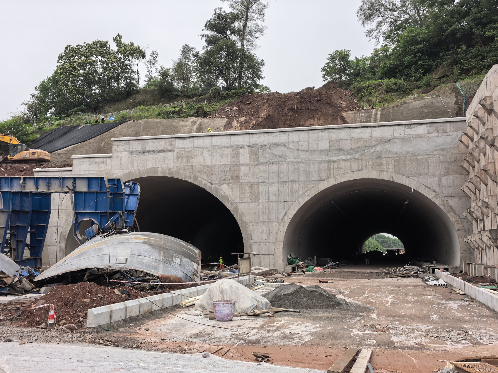 目前,隧道内正进行电缆沟、排水沟等附属工程施工;东侧隧道口工人正在修筑路沿石,确保与外部道路平顺衔接;西侧隧道口则在进行水稳层养护,为沥青铺装做准备。
