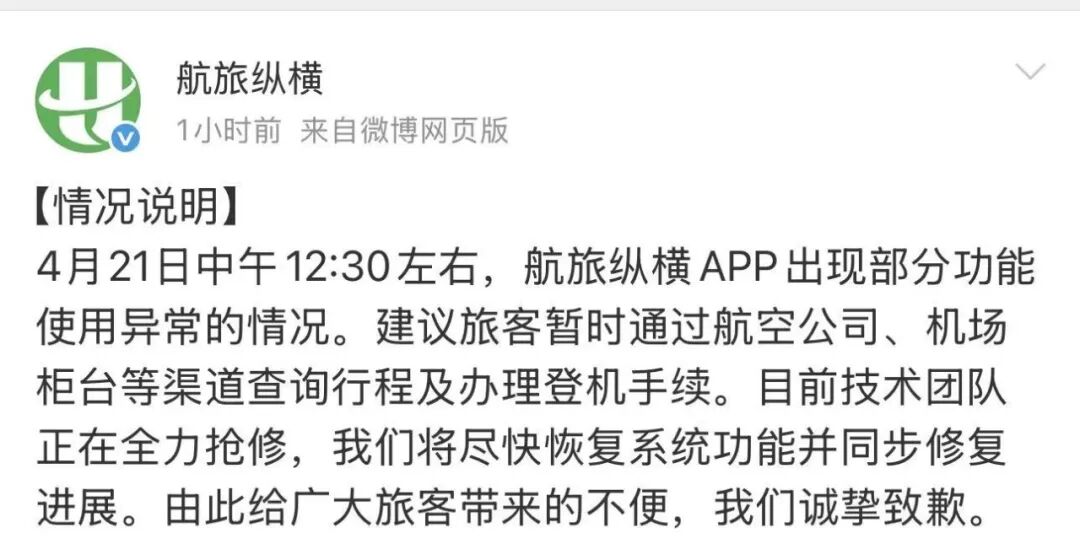 21日下午航旅纵横发布微博表示:“4月21日中午12:30左右,航旅纵横App出现部分功能使用异常的情况。建议旅客暂时通过航空公司、机场柜台等渠道查询行程及办理登机手续。目前技术团队正在全力抢修,我们将尽快恢复系统功能并同步修复进展。由此给广大旅客带来的不便,我们诚挚致歉。”