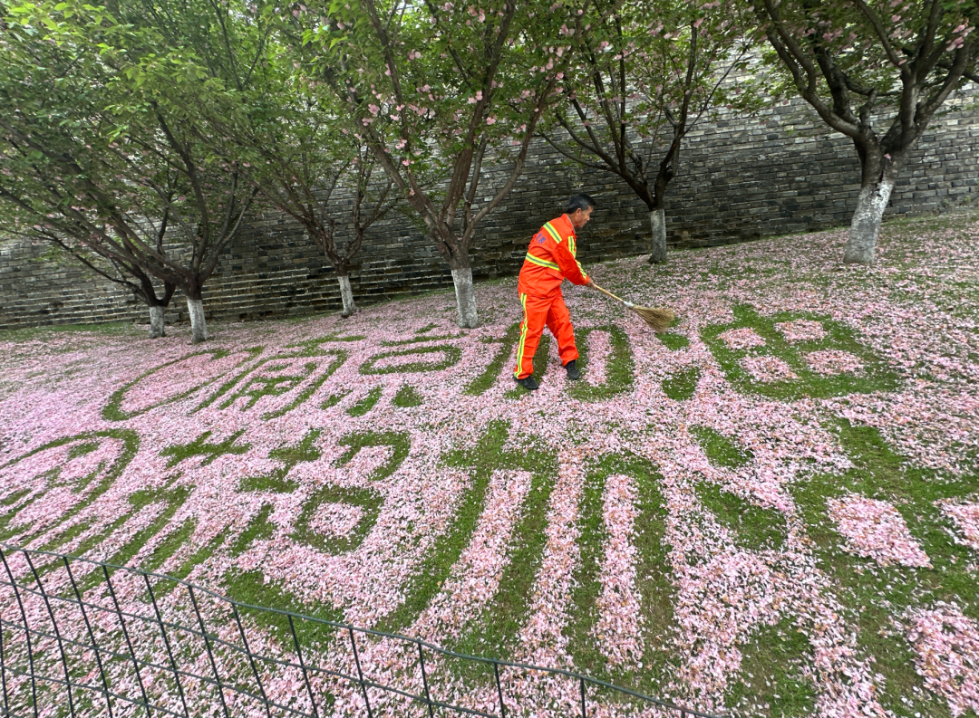 春色正好,玄武湖畔神武路的晚樱依旧纷飞。去年你用满地的金黄银杏,在城墙下铺展出一条关于时间的隧道;今年你又以笤帚为“笔”、落花为“墨”,在这明城墙的脚下,工工整整地写下“南京♡苏超”。你用最质朴的匠心,为这座城市的春天添加了一抹靓丽的粉色。