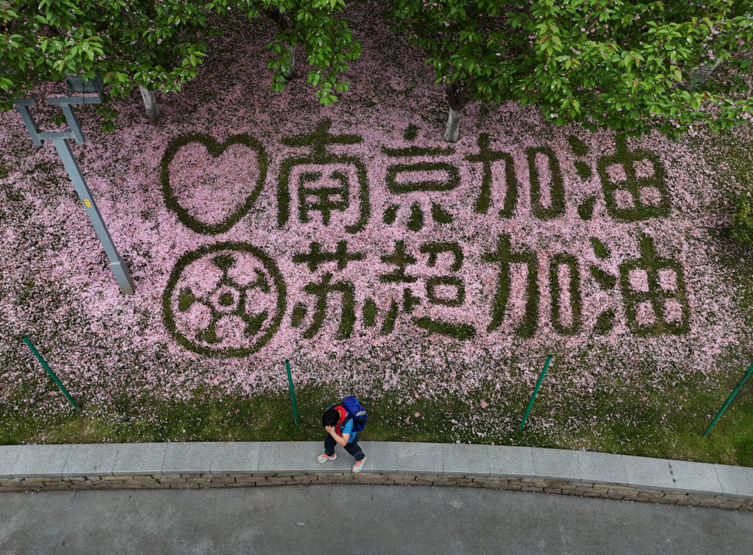 此前报道:4月15日,明城墙神武路沿线迎来一抹浪漫亮色——玄武湖综管办管养员刘金顶以草坪为“纸”、笤帚为“笔”、落花为“墨”,精心勾勒出“南京加油、苏超加油”的创意景观,用最质朴的匠心,为“苏超”南京队送上最特别的加油祝福。