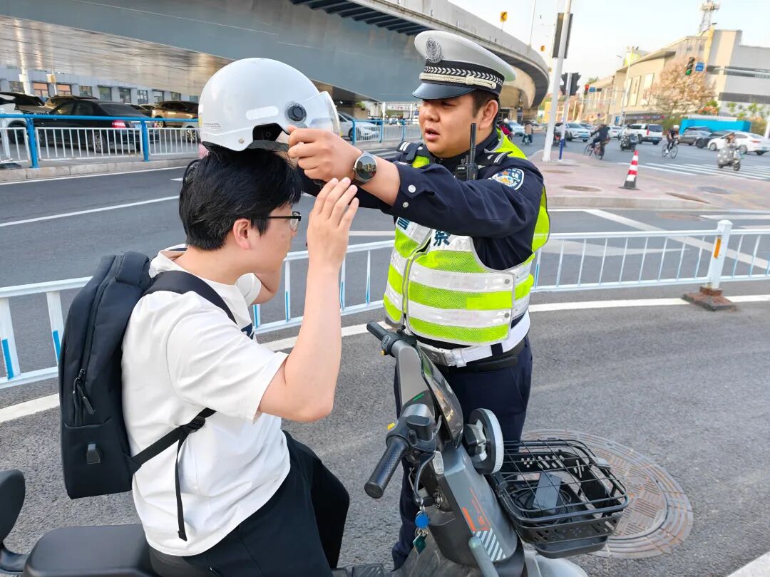 图为焦亚楠提醒出行群众正确佩戴安全头盔。