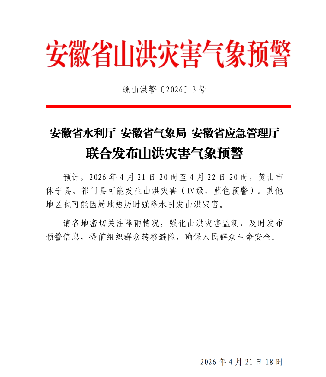 4月21日18时,安徽省水利厅、安徽省气象局、安徽省应急管理厅联合发布山洪灾害气象预警: