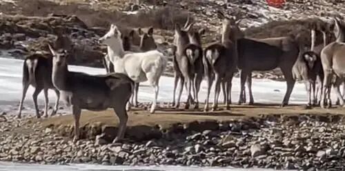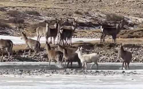近日,玉树藏族自治州囊谦县国有林场巡护人员白玛尕旺,在开展巡护工作时,意外发现正在河边饮水的马鹿群中,有一只通体毛色雪白的个体,在普通棕褐色马鹿群中格外醒目,这也是囊谦县继2017年首次发现野生白色型马鹿后,再次记录到这一珍稀物种个体。