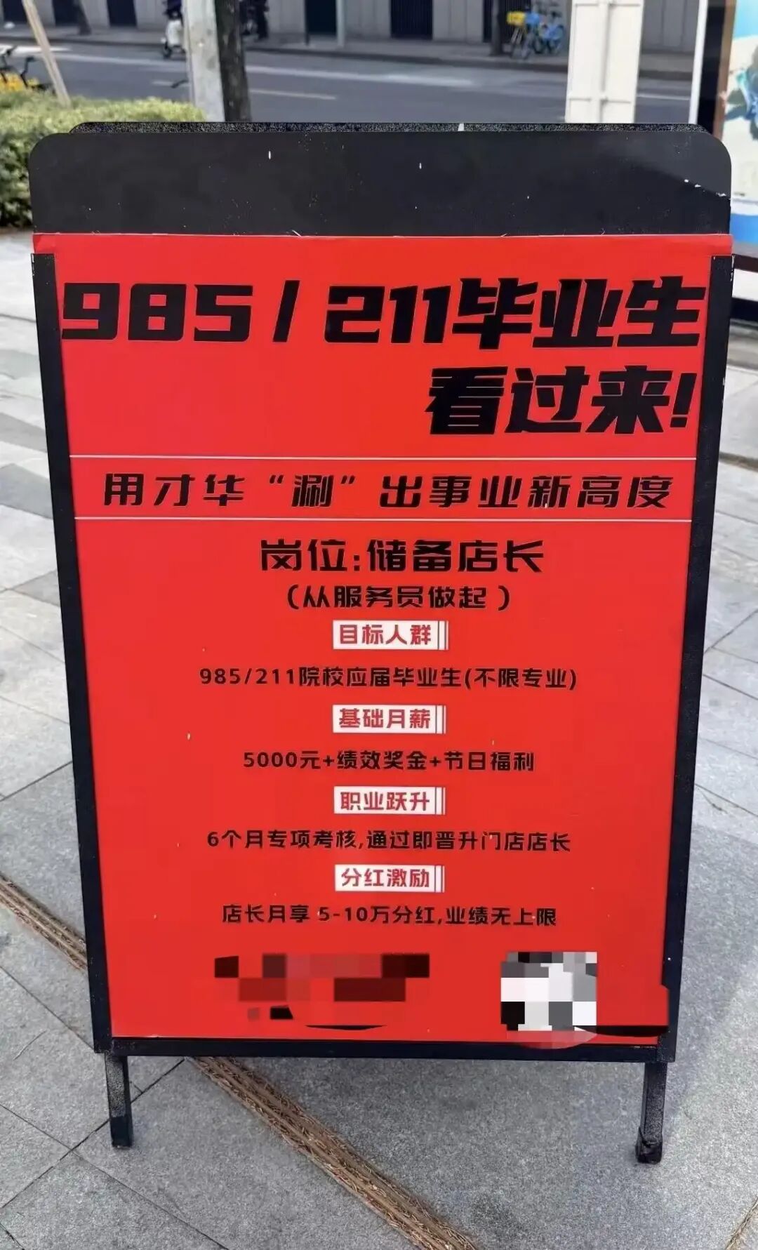 近日,有网友在社交平台分享图片称,深圳一家火锅店门口摆出招聘启事,上面写着“985/211毕业生看过来”,招聘岗位为储备店长岗位,目标人群是985/211院校应届毕业生,不限制专业,业绩达标的话底薪5000元,还有业绩叠加,节日福利。