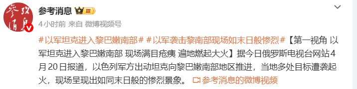 据@参考消息援引今日俄罗斯电视台网站4月20日报道,以色列军方出动坦克向黎巴嫩南部地区推进,当地多处目标遭袭起火,现场呈现出如同末日般的惨烈景象。