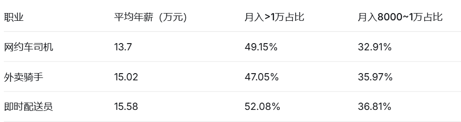 上述数据说明,网约车司机是一份在社会中属于“收入中等,用一定体力/精力换稳定报酬”的工作,比很多纯体力劳动收入高,能提供一个“温饱以上、略有结余”的生活,但很难靠它实现财富积累,高薪空间有限。