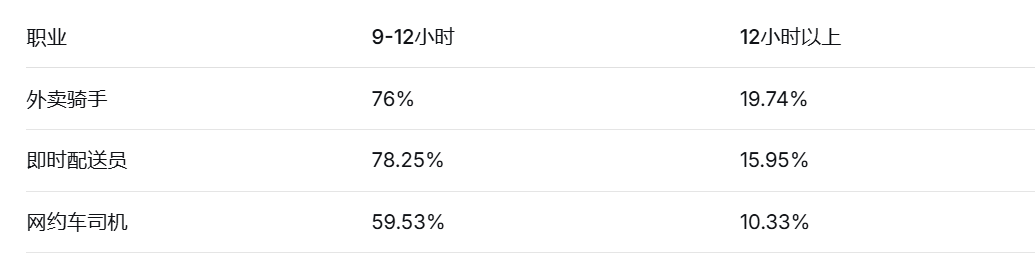 就业时间灵活是新业态行业的一大特点。然而,外卖骑手、即时配送员的高收入,有很大一部分是靠高工作时长积累的。据广州蓝宝书统计,76%的外卖骑手、78.25%的即时配送员工作时长为9-12小时,而网约车司机工作时长在9-12小时的占比为59.53%。19.74%的外卖骑手、15.95%的即时配送员工作12小时以上,而网约车司机工作时长在12小时以上的占比为10.33%,均相对更短。