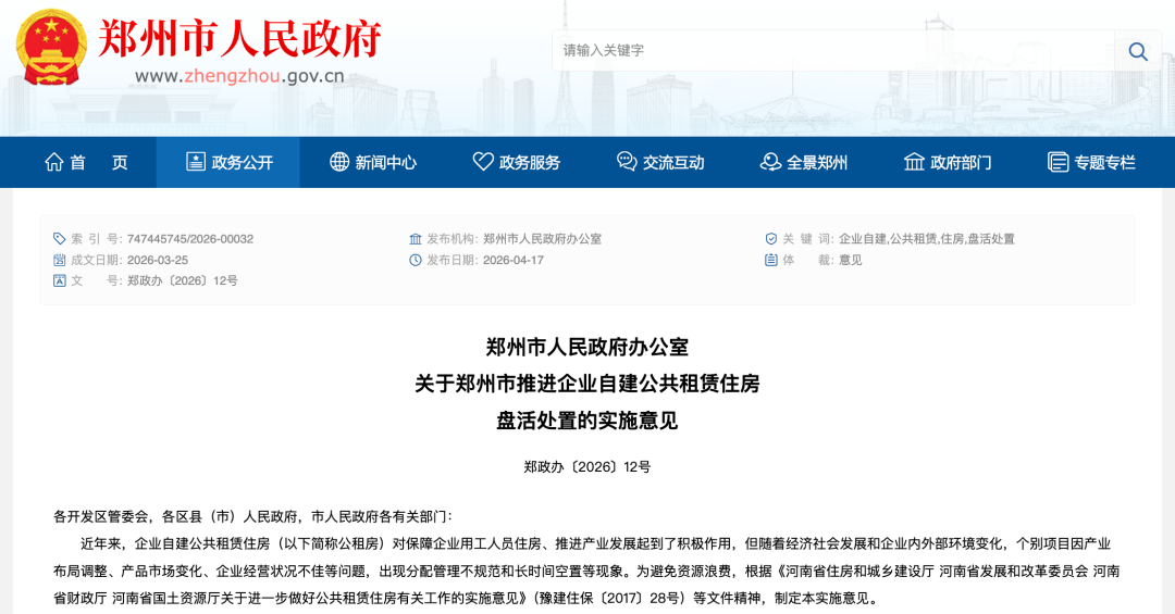 近日,郑州市政府办公室印发《关于郑州市推进企业自建公共租赁住房盘活处置的实施意见》,针对部分企业自建公租房出现的空置、管理不规范等问题,明确盘活处置的总体要求、基本原则、具体方式等,着力破解资源闲置难题,做到国有资产保值、保障水平提升与企业利益保障的有机统一。