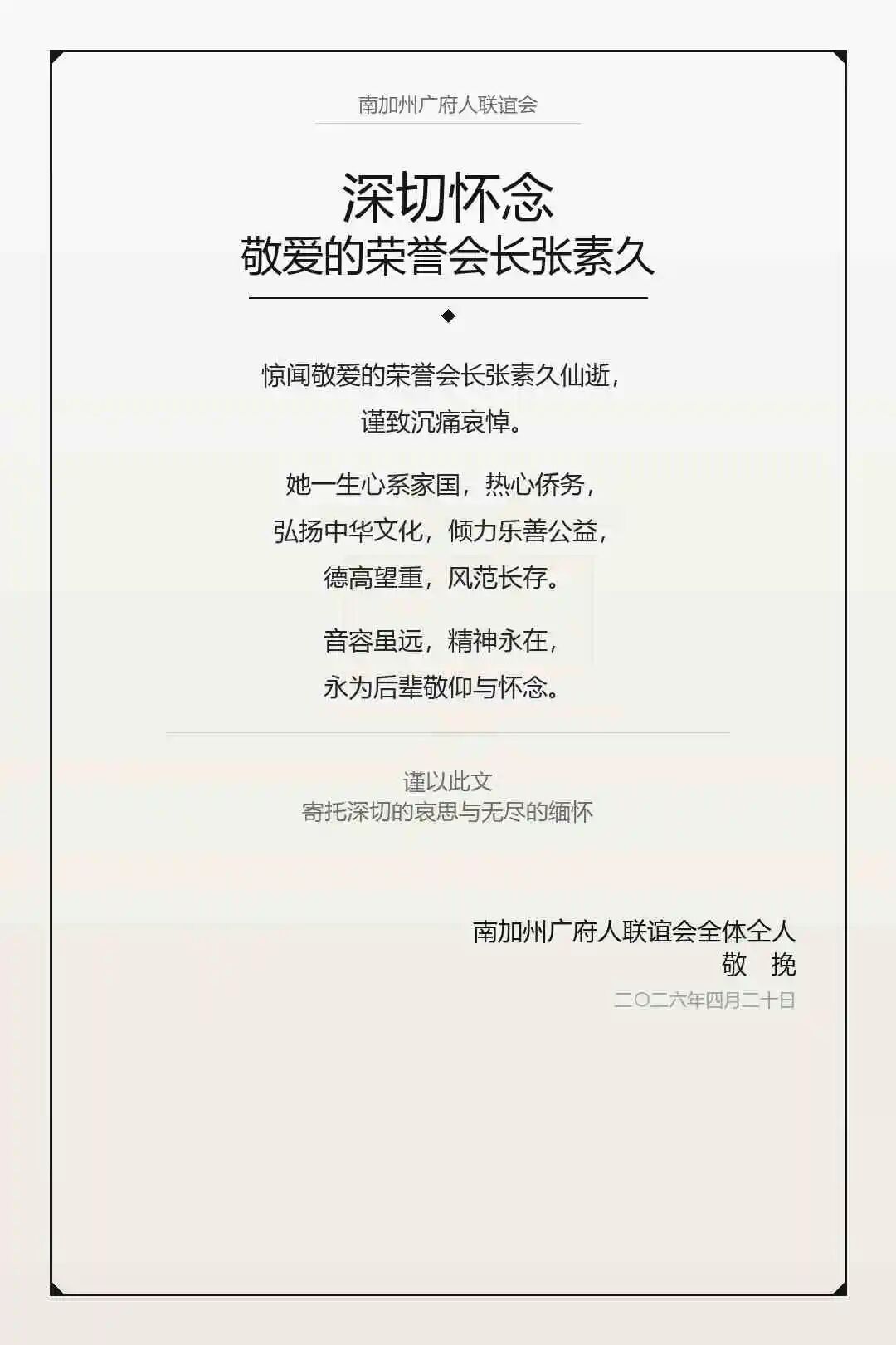 北京时间4月21日,记者从美国北京联谊会会长北奥处获悉,著名侨领张素久于当地时间2026年4月20日19时在美国南加州逝世,享年91岁。张素久是著名爱国将领、“和平将军”张治中的小女儿。