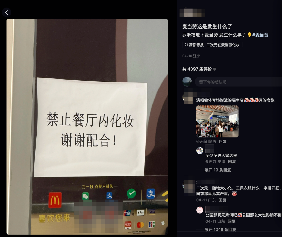除占用座位外,cosplay爱好者化妆时使用的喷雾、假睫毛碎屑等,易飘落到其他顾客的用餐区域,部分化妆品还会沾染在餐厅白色餐桌上,增加清洁难度。同时,一些化妆人群交谈声音较大、道具随意摆放,也让部分顾客感到餐厅环境混乱。有的顾客受到影响,就会向麦当劳公司投诉平台反映相关问题。
