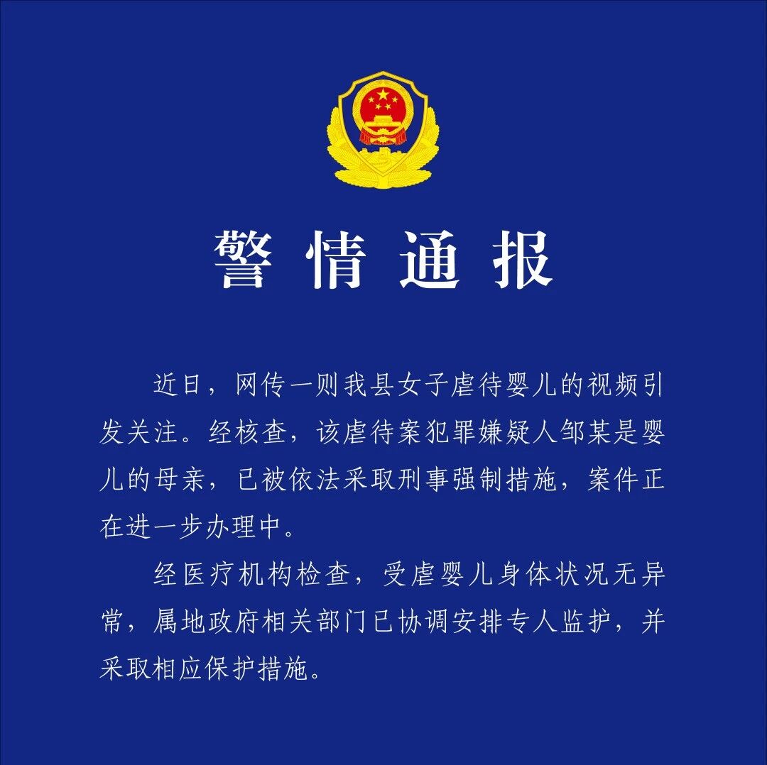 江西南昌县公安局发布警情通报:近日,网传一则我县女子虐待婴儿的视频引发关注。经核查,该虐待案犯罪嫌疑人邹某是婴儿的母亲,已被依法采取刑事强制措施,案件正在进一步办理中。经医疗机构检查,受虐婴儿身体状况无异常,属地政府相关部门已协调安排专人监护,并采取相应保护措施。